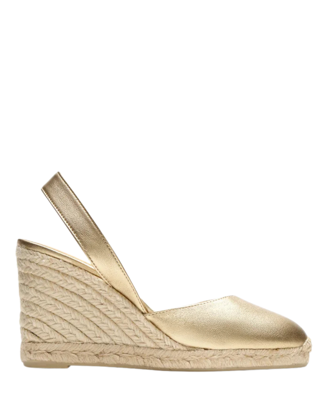 Iconic Carissa slingback espadrilles in metallic leather with cushioned insole and 9 cm jute wedge.