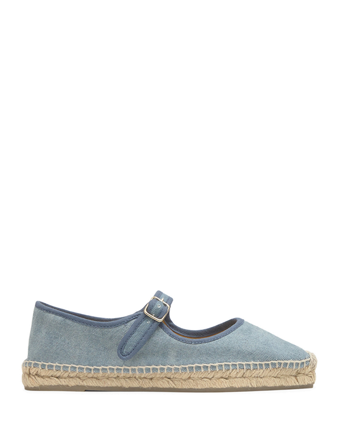 Padua mary-jane style flat espadrille in washed organic cotton with buckle closure and jute sole.