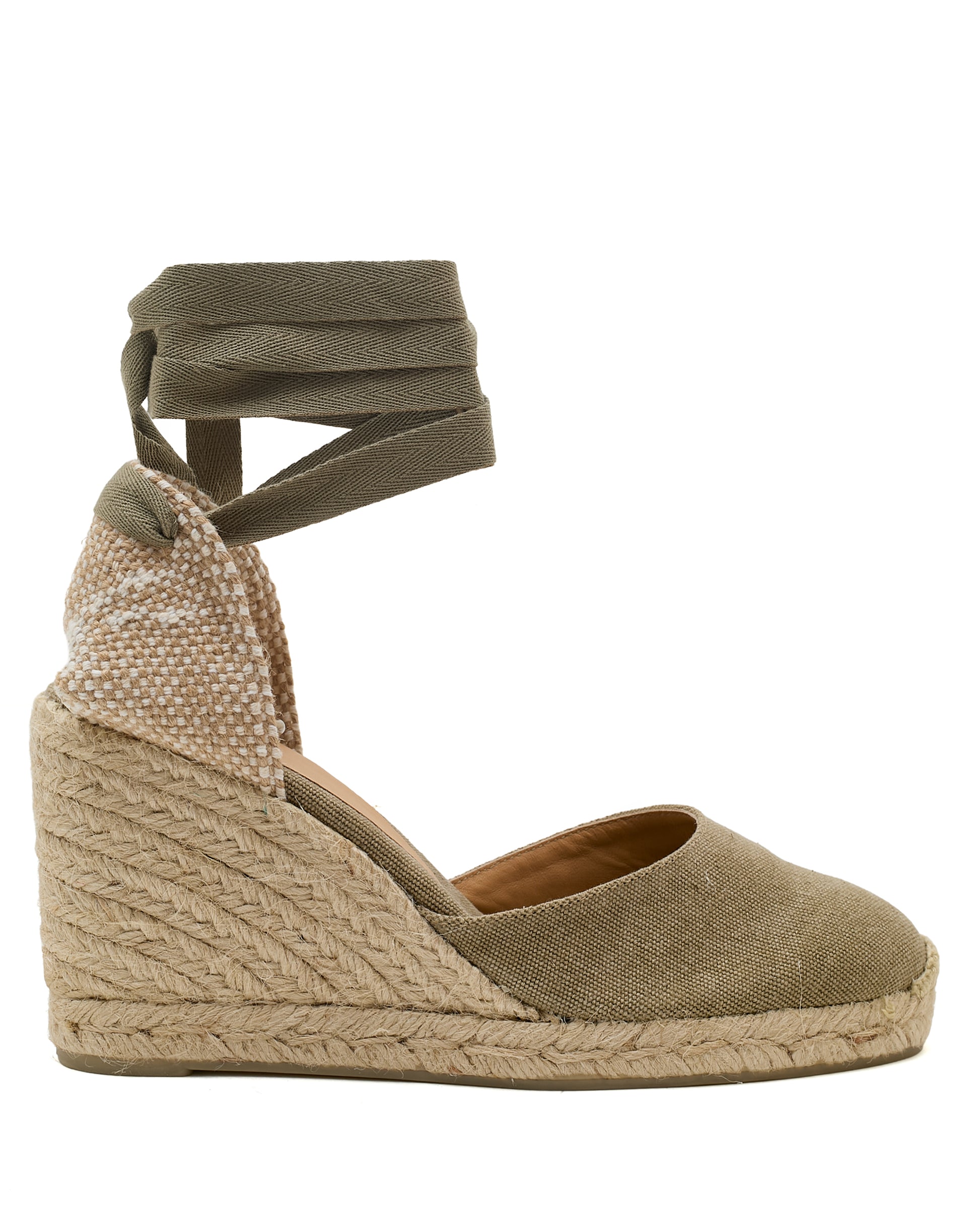 Iconic Carina espadrille in organic cotton with lace-up closure, cushioned insole and 9 cm jute wedge.