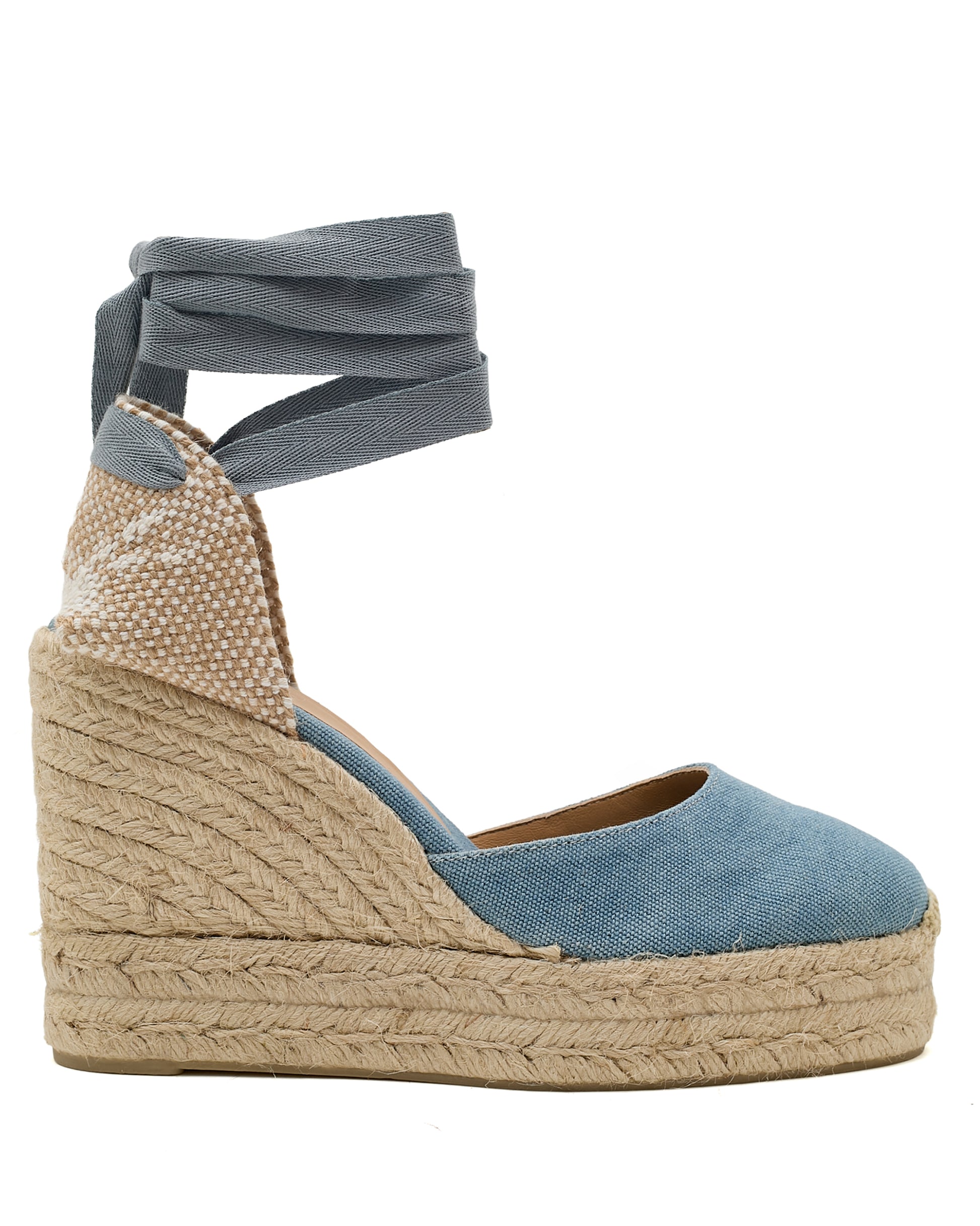 Iconic Carina espadrille in organic cotton with lace-up closure, cushioned insole and 9 cm jute wedge.