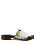 The MIRI slip-on clog sandal is a vibrant addition to your spring and summer wardrobe, designed to make a statement with its bold combination of premium materials and playful contrasts. Crafted from leather, suede, and pony hair, it features a distinctive layered design highlighted by a contrasting sock sleeve for added dimension. Antique-finished studs bring a touch of vintage sophistication, perfectly balancing the modern appeal of the wooden clog base. With its durable resin outsole, MIRI ensures all-day comfort and support, making it as practical as it is stylish. Available in four striking colourways, each blending bright summer hues and contrasting textures, these clogs are a celebration of effortless chic, perfect for elevating any warm-weather ensemble.
