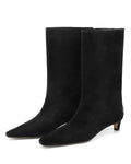 The boot features a sleek almond toe, a clean knee-high shaft, and a modest low stacked heel for everyday comfort and effortless poise. Its minimalist profile creates a streamlined line that pairs beautifully with dresses, skirts, or your favorite denim, making it a versatile staple in any wardrobe.