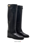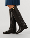 The Riley Santa Monica Nero boot features luxurious Italian leather complemented by a stylish gold top buckle, blending classic craftsmanship with modern sophistication. Designed for those who appreciate refined details, this boot offers a polished look and lasting comfort for any elegant ensemble.