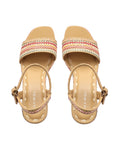 The SIMA strap platform wedge sandal is the ultimate expression of refined coastal chic, designed to elevate your summer wardrobe with effortless flair. Crafted with a natural raffia upper, it evokes a breezy, sun-kissed vibe while the leather lining and leather-wrapped footbed ensure indulgent comfort from sunrise to sunset. The brushed gold branded buckle injects a touch of opulence, while the Nokwol stainless steel pin delivers a distinctive, signature detail. The raffia-wrapped platform wedge, with a 70mm heel, strikes the perfect balance between bold height and wearable ease, making these wedges a standout yet comfortable option. The durable resin outsole ensures steady footing, so you can step confidently wherever the day takes you. Whether paired with a flowy dress or wide-leg pants, the SIMA sandal exudes effortless luxury and captures a sense of sun-drenched glamour that elevates any look.