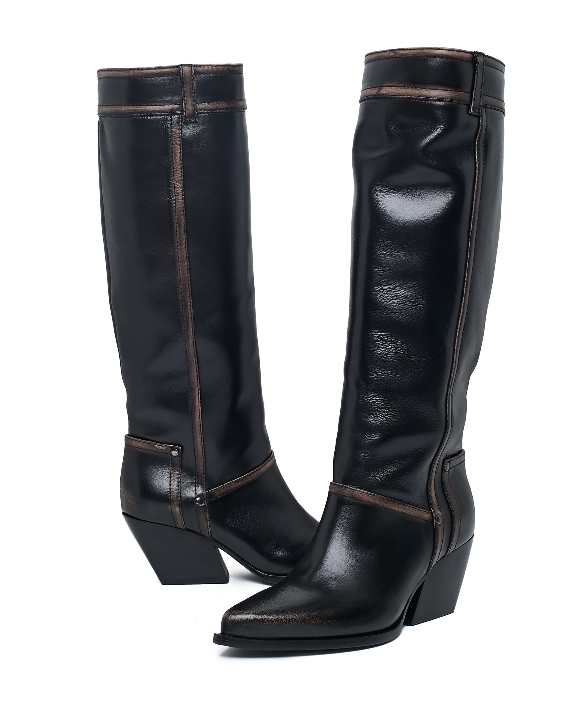 The TALL COWBOY boots combine a classic western silhouette with a modern, fresh twist. Crafted with a full leather upper featuring a vintage distressed finish, these boots offer a rugged yet refined look. The leather lining and footbed provide exceptional comfort, while the pull-on style adds ease of wear. With a 70mm heel height, they are a comfortable walking boot that doesn't compromise on style. The leather outsole and stacked heel ensure durability and sophistication. Made in Italy, these boots are the ultimate cool, contemporary statement piece—an absolute must-have this winter.