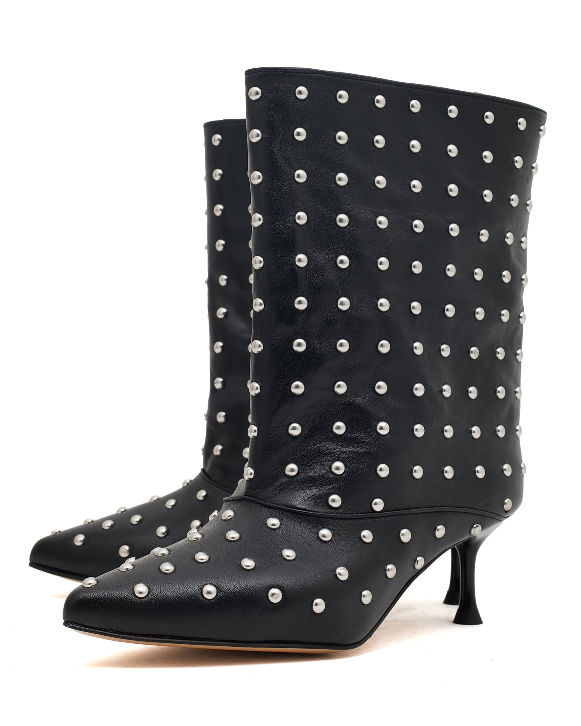 Masterful Embellishment: A dense, uniform constellation of Polished Silver-Tone Dome Studs blankets the entire boot, from the elongated, Precision Pointed Toe up the mid-calf shaft. The consistent application of hardware provides a visual texture that is both rebellious and richly opulent.